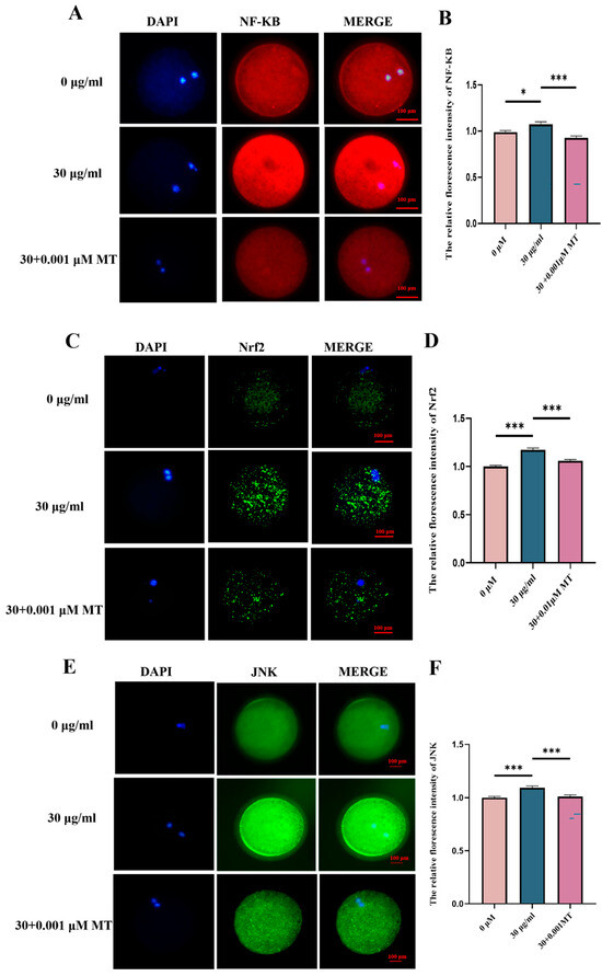 Based on the above findings, ROS was identified as a key signaling factor in the maturation of porcine oocytes induced by PS-MPs. To verify that PS-MPs induce oxidative stress, mitochondrial damage, and inflammatory responses through the NF-κB/Nrf2/JNK MAPK signaling pathway, the protein level of NF-κB was first assessed. Compared to the control group, the NF-κB protein level was significantly higher in the 30 µg/mL PS-MPs group. Furthermore, the NF-κB protein level was significantly reduced in the MT-treated group compared to the PS-MPs group. Fluorescence intensity analysis confirmed this finding (NF-κB: control: 1.00 ± 0.11, n = 46 oocytes vs. PS-MPs: 1.07 ± 0.18, n = 36 oocytes vs. MT: 0.93 ± 0.14, n = 54 oocytes, n = 3) (Figure 7A).