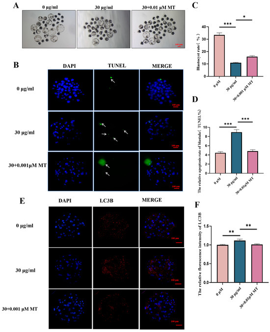 MT alleviates the subsequent developmental damage of PS-MPs to porcine oocytes during maturation and early embryonic development. (A) Representative images of early embryonic development in oocytes from the control, 30 µg/mL PS-MPs, and MT-treated (0.001 μM) groups. Scale = 100 µm. (B) Relative fluorescence intensity analysis of TUNEL levels in early embryos after treatment with control, 30 µg/mL PS-MPs, and 0.001 μM MT. *, p < 0.05, **, p < 0.01, ***, p < 0.001. (C) Statistical analysis of blastocyst formation after treatment with control, 30 µg/mL PS-MPs, and 0.001 μM MT. *, p < 0.05, ***, p < 0.001. (D) TUNEL statistical analysis of blastocyst apoptosis after treatment with control, 30 µg/mL PS-MPs, and 0.001 μM MT. ***, p < 0.001. (E) Representative images of LC3B levels in oocytes after control treatment. (F) Relative fluorescence intensity analysis of LC3B levels in oocytes after treatment with control, 30 µg/mL PS-MPs, and 0.001 μM MT. **, p < 0.01. Each oocyte’s average fluorescence intensity was statistically analyzed. Error bars indicated the mean ± SEM. p-values were calculated using the ANOVA test. The experiment of each group was repeated three times.