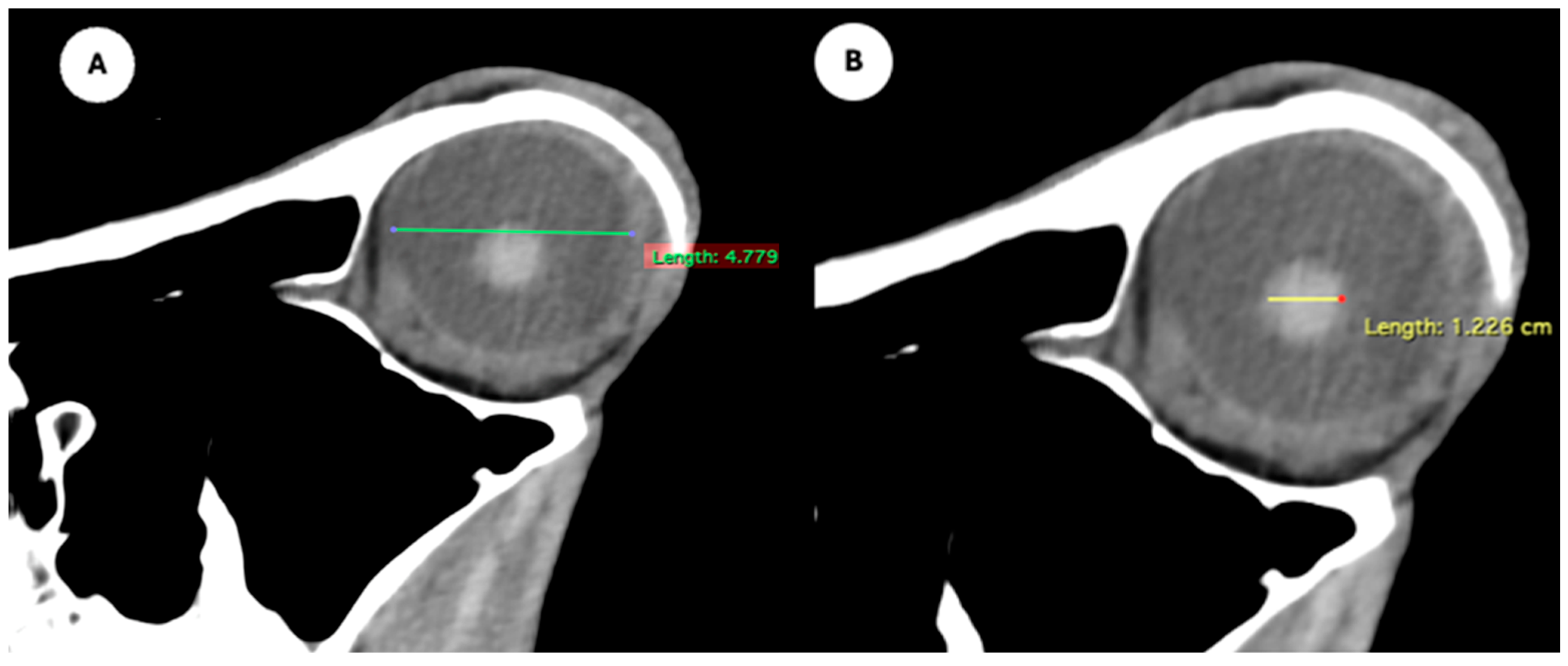 Manual contouring on every slice of the CT images was performed by a single examiner, with contours for the eyeball and the lens generated for both eyes in each patient. Measurements for the intraocular distances were calculated by the same single examiner in all patients. The measurement approach followed the protocol outlined in previous studies conducted on dogs and cats [