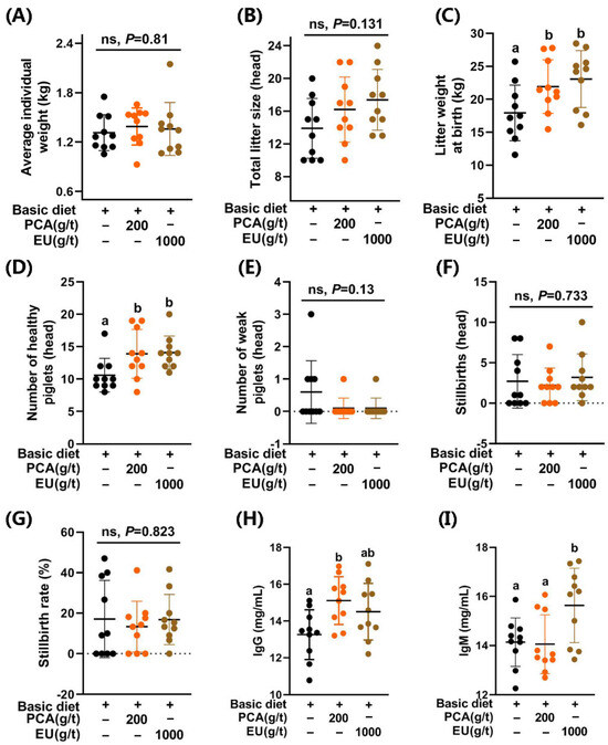 As shown in Figure 1, supplementation with PCA significantly increased the litter weight at birth (p < 0.05, Figure 1C) and the number of healthy piglets (p < 0.05, Figure 1D). A similar improvement was observed in the EU group (p < 0.05). However, they had limited effects (p > 0.05) on the average individual weight (Figure 1A), total litter size (Figure 1B), the number of weak piglets (≤0.5 kg) (Figure 1E), the number of stillbirths (Figure 1F), and the stillbirth rate (Figure 1G).