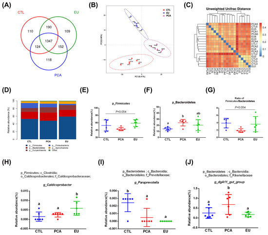 Effects of PCA and EU on gut microbiota in sows during late pregnancy. (A) Venn plot between the CTL, EU, and PCA groups. (B) PLS-DA. (C) β-diversity indices of unweighted_unifrac_distance. The redder the color, the farther the distance. (D) Relative abundance of gut microbiota at phylum levels. Relative abundance of Firmicutes (E) and Bacteroidetes (F). (G) Ratio of Firmicutes to Bacteroidetes. Relative abundance of Caldicoprobacter (H), Paraprevotella (I), and dgA11_gut_group (J). EU, Eucommia ulmoides leaf extract; PCA, protocatechuic acid; PLS-DA, partial least squares discrimination analysis. Different lowercase letters above the bars indicate statistically significant differences among groups (p < 0.05).