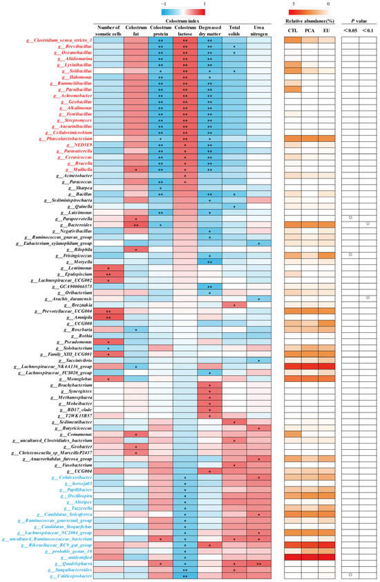 Correlation of genera and colostrum indicators. The intensity of the colors represents the degree of association (red, positive correlation; blue, negative correlation) or represents the relative abundance of a specific genus in CTL, PCA, and EU groups from 0–5% (from white to red). Significant correlations were found at * p < 0.05, ** p < 0.01, which represent in the form of a circle. EU, Eucommia ulmoides leaf extract; PCA, protocatechuic acid.