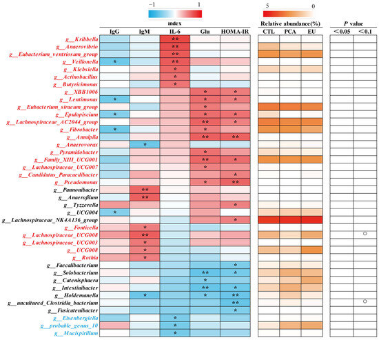 Correlation of genera and immunoglobulins together with serum indicators. The intensity of the colors represents the degree of association (red, positive correlation; blue, negative correlation) or represents the relative abundance of a specific genus in CTL, PCA, and EU groups from 0–5% (from white to red). Significant correlations were found at * p < 0.05, ** p < 0.01, which represent in the form of a circle. EU, Eucommia ulmoides leaf extract; Glu, glucose; HOMA-IR, homeostasis model assessment-estimated insulin resistance; PCA, protocatechuic acid.