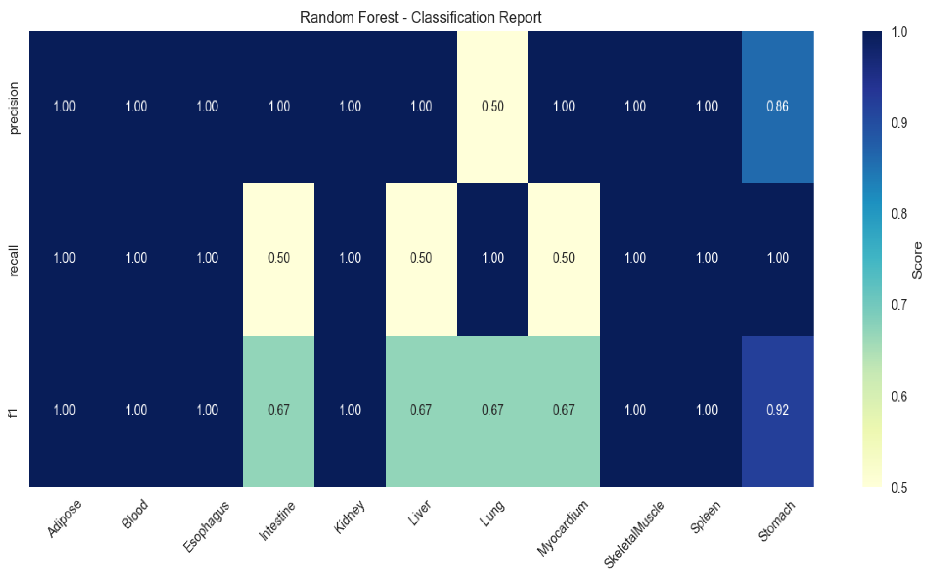 To validate the discriminative power of these genes, multi-class classification models were trained using Random Forest (RF), Extreme Gradient Boosting (XGBoost), and Support Vector Machine (SVM). RF achieved peak performance (mean F1-score: 0.86 ± 0.11), with perfect classification (F1 = 1.00) for adipose, kidney, and spleen (
