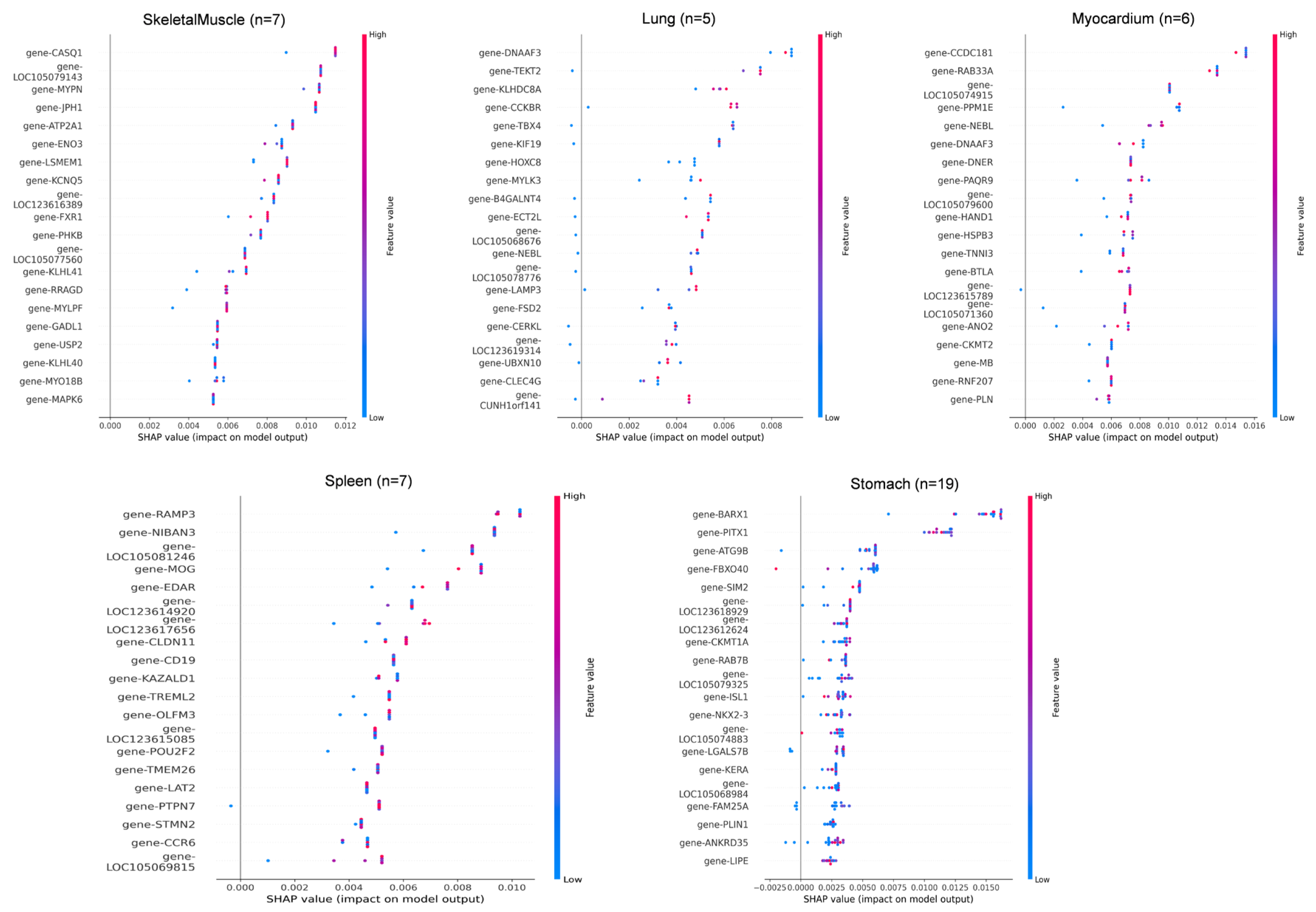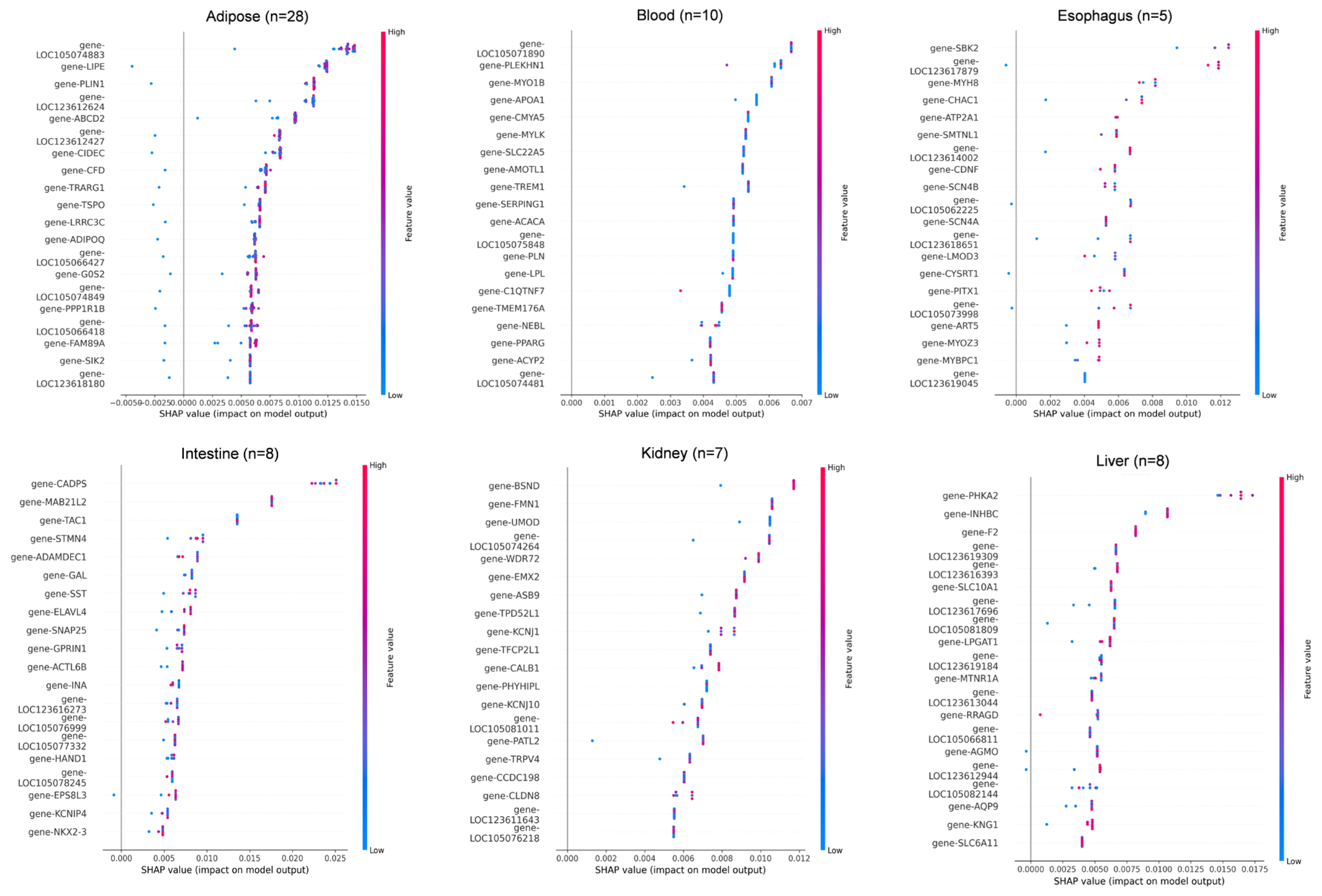 In adipose tissue (n = 28), LOC105074883, LIPE, and PLIN1 showed the highest SHAP contributions, consistent with their roles in lipid metabolism. In blood (n = 10), key genes included LOC105071890, PLEKHN1, and MYO1B, all showing SHAP values in the 0.004–0.007 range. In esophagus (n = 5), SBK2, LOC123617879, and MYH8 were the dominant predictors, though sample scarcity led to greater SHAP dispersion. For intestine (n = 8), CADPS, MAB2112, and TAC1 showed strong positive impacts on classification. In kidney (n = 7), BSND, FMN1, and UMOD were top contributors, reflecting roles in ion transport and metabolism. In liver (n = 8), core genes included PHKA2, INHBC, and F2, with SLC10A1 showing a linear in-crease in SHAP value relative to expression. In lung (n = 5), DNAAF3, TEKT2, and KLHDC8A had narrow SHAP ranges, and misclassification with myocardium was observed, possibly due to functional overlap. Additional key drivers included CCDC181 and RAB33A in myocardium, CASQ1, MYPN, and LOC105079143 in skeletal muscle, RAMP3 and NIBAN3 in spleen, and BARX1, PITX1, and ATG9B in stomach.