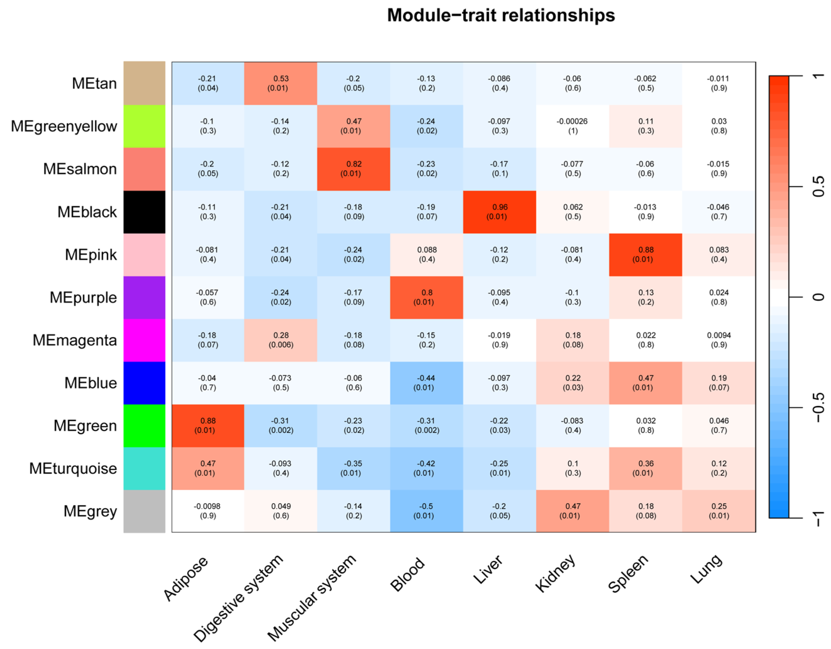 Figure 8). Crucially, each module corresponds directly to a specific physiological system or organ, as defined by our initial tissue sampling and module-trait relationship analysis (see