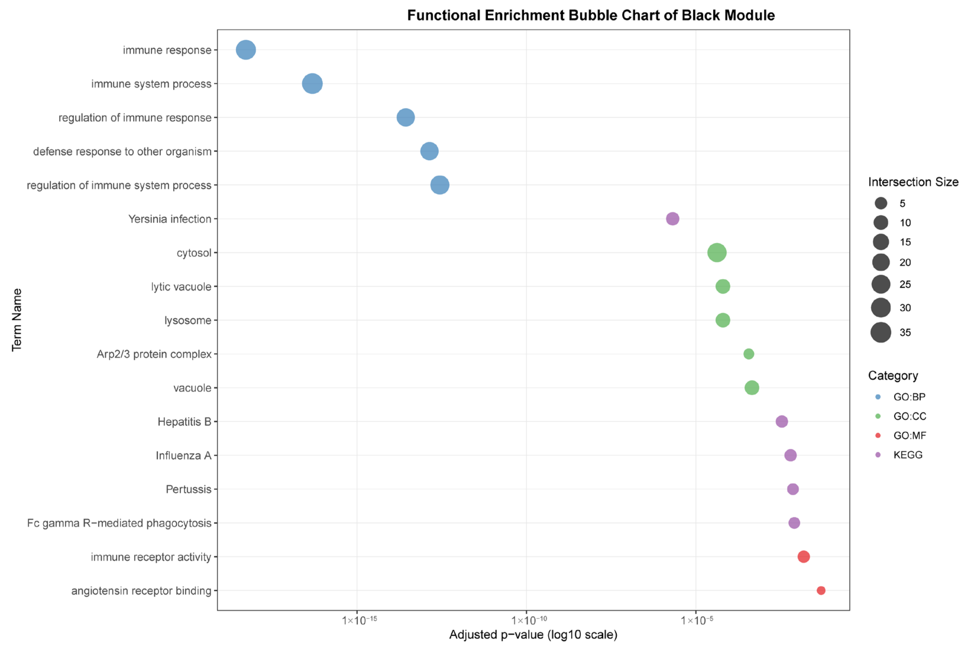 Figure 7, the black module (88 genes), highly correlated with liver (r = 0.96), was predominantly enriched for core immune functions, including “immune response,” “defense response to other organism,” and pathways related to specific infections such as “Yersinia infection” and “Hepatitis B.” The association with cellular components like “lysosome” and “lytic vacuole” underscores this module’s role in hepatic pathogen clearance and immune activation.