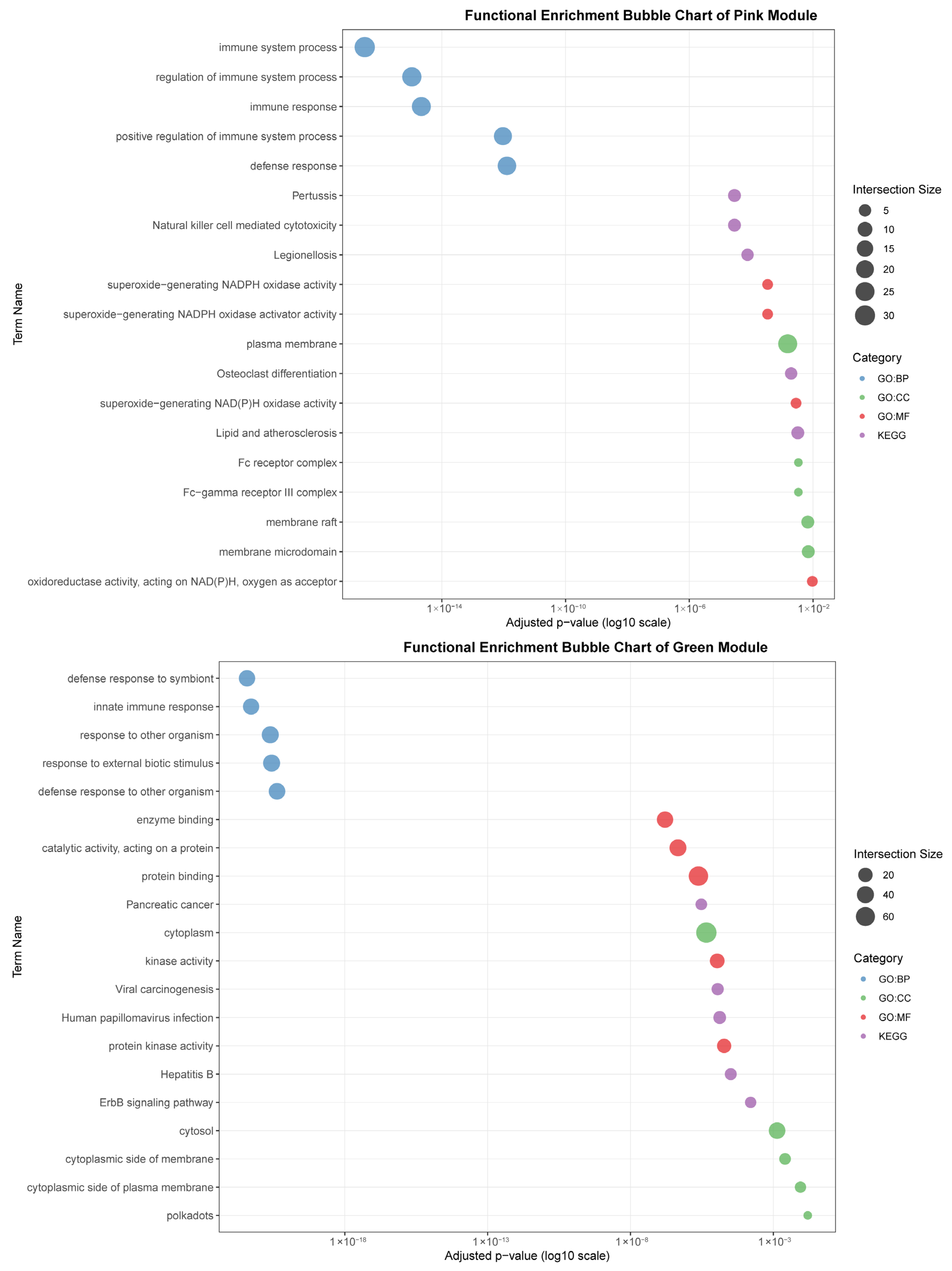 The pink module (282 genes) showed a strong correlation with the spleen (r = 0.88). It was characterized by terms related to broad immune regulation (“immune system process,” “defense response”) and effector functions, such as “Fc receptor complex” and “superoxide-generating NADPH oxidase activity.” Its enrichment in pathways like “Natural killer cell mediated cytotoxicity” and “Osteoclast differentiation” highlights its role in coordinating innate and adaptive immune responses within the spleen.