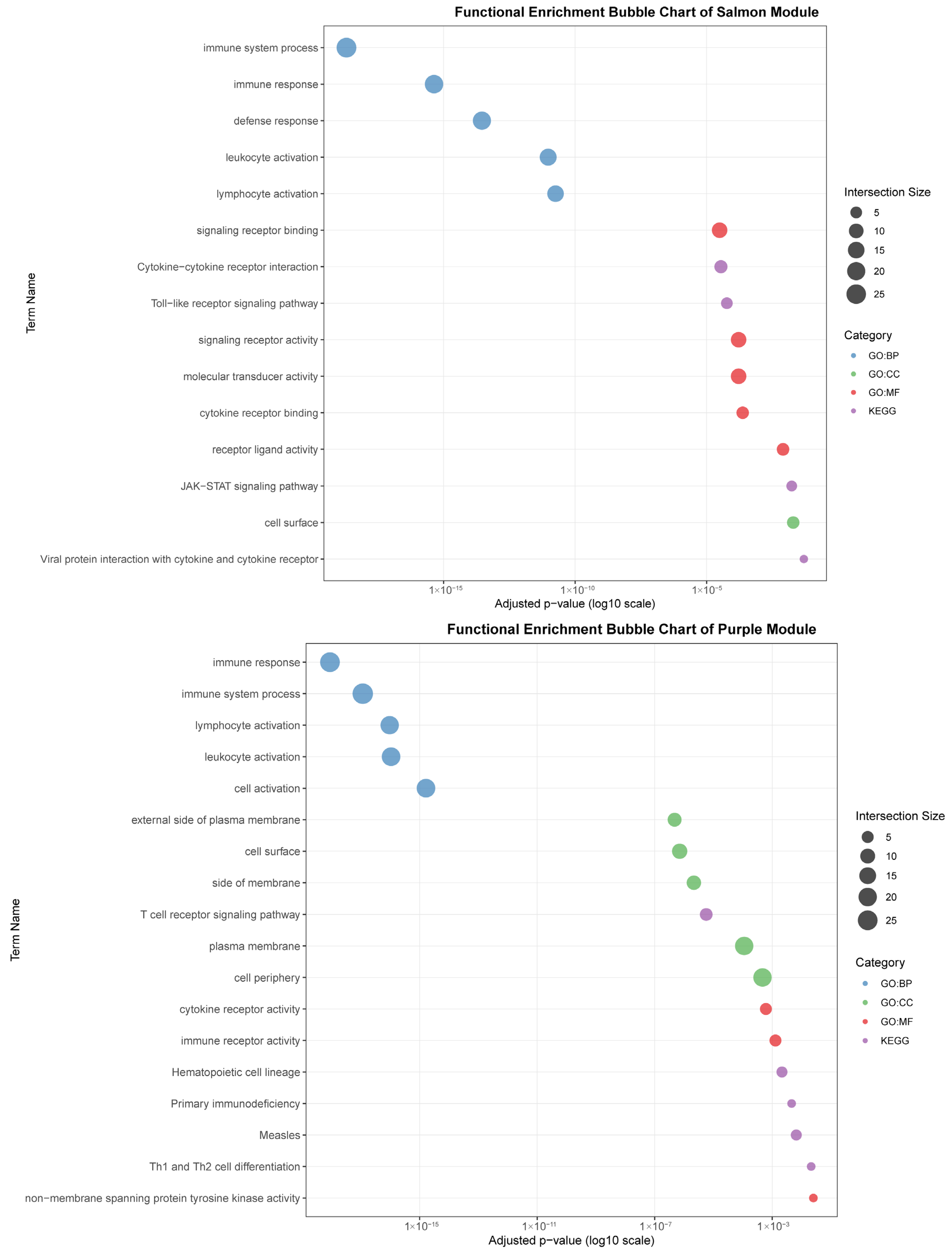 The purple module (44 genes), linked to blood (r = 0.80), was defined by lymphocyte and cell surface activities. Key terms included “lymphocyte activation,” “T cell receptor signaling pathway,” and “cell surface.” Its connection to KEGG pathways such as “Primary immunodeficiency” and “Th1 and Th2 cell differentiation” emphasizes its critical function in blood-cell-mediated immunity and T-cell communication.
