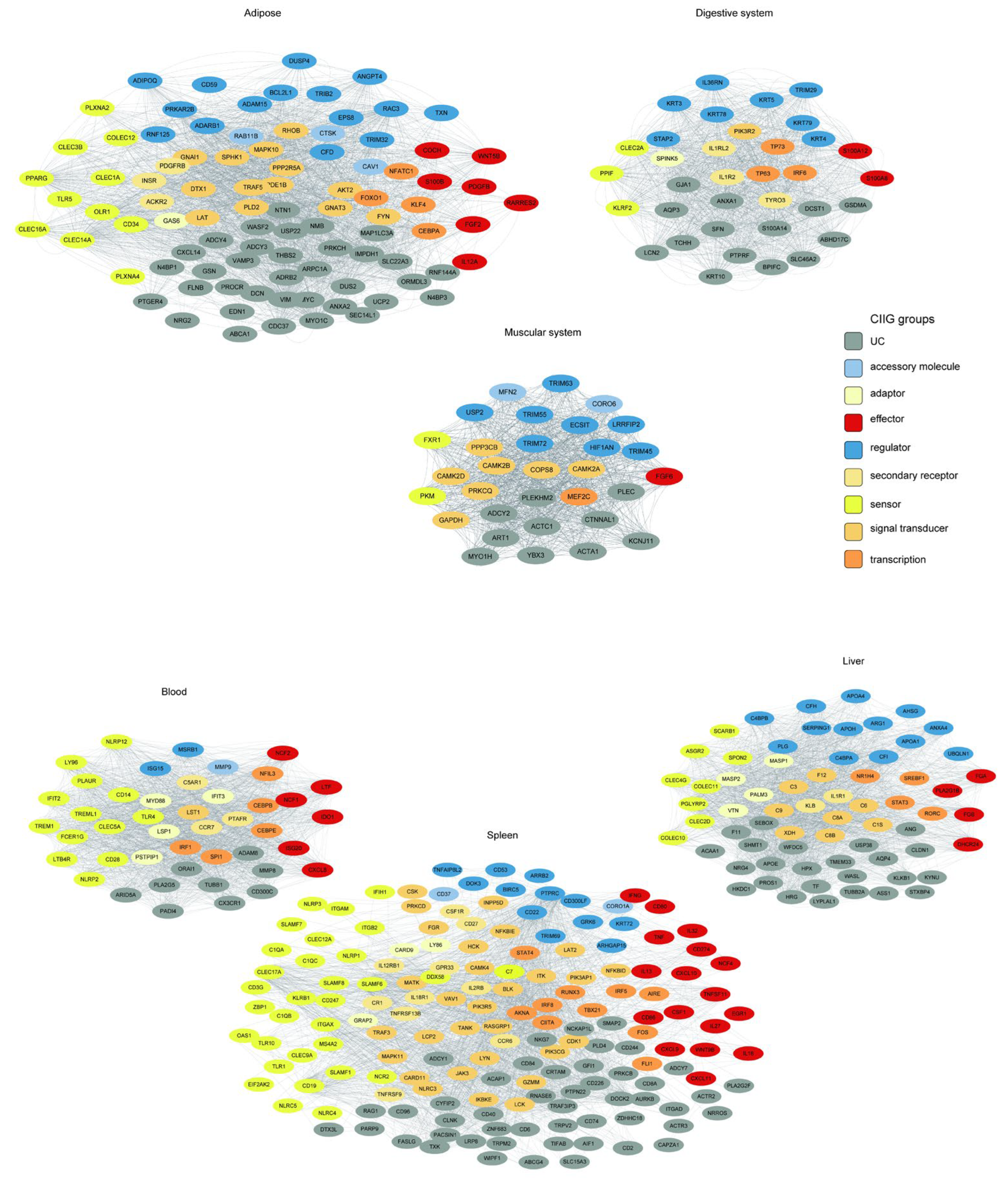 Figure 8) formed unique connectivity patterns in each tissue. This resulted in tissue-specific “interactomes,” in which genes involved in pathogen perception, signaling, and effector functions were connected in distinct topological patterns. This rewiring likely underlies the specialization of the innate immune response, enabling the gastrointestinal system to manage commensal and pathogenic microbes differently from how the liver handles systemic inflammation or the adipose tissue integrates immunometabolic signals.