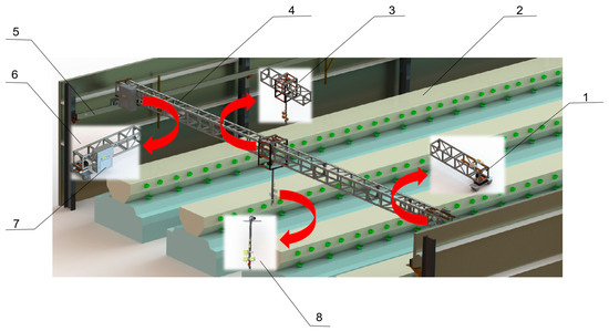 The overall hardware design of LIVEMOS-G system. (1) Adjustable motion unit of X-axis motion module; (2) Rabbit cages; (3) Y-axis motion module; (4) Y-axis beam; (5) Fixed motion unit of X-axis motion module; (6) Fixed motion unit of X-axis motion module; (7) Electrical control cabinet; (8) Z-axis multi-sensing module.