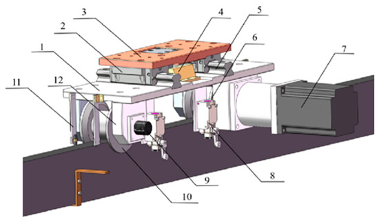 Hardware design of the adjustable motion unit. (1) Main board; (2) Slider; (3) Y-axis beam connector; (4) Adjustable motion stopper; (5) Linear guide; (6) Active wheel; (7) X-axis left motor; (8) Limit switch; (9) Left encoder; (10) Passive wheel; (11) Gap sensor; (12) Wheel support.