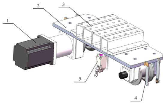 Hardware design of the fixed motion unit. (1) X-axis right motor; (2) Main board; (3) Steel square tube spacer; (4) Gap sensors; (5) Limit switch.