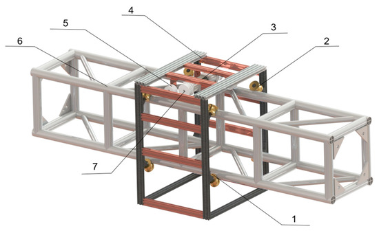 Hardware design of the Y-axis motion module. (1) U-shaped wheel; (2) U-shaped wheel support; (3) Driving module; (4) Aluminum frame; (5) Tensioner pulley; (6) Y-axis beam; (7) Timing belt pulley.