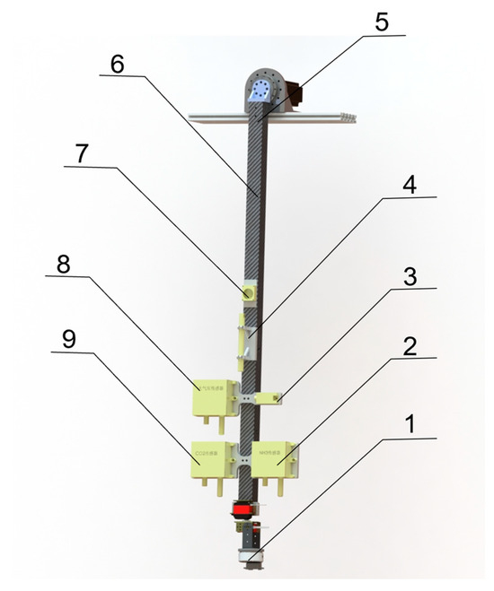 Hardware design of the Z-axis module. (1) Multi-source imaging module; (2) NH3 sensor; (3) Temperature humidity sensor; (4) Wind speed sensor; (5) Z-axis motion module; (6) Carbon Fiber rod; (7) Light sensor; (8) Air pressure sensor; (9) CO2 sensor.
