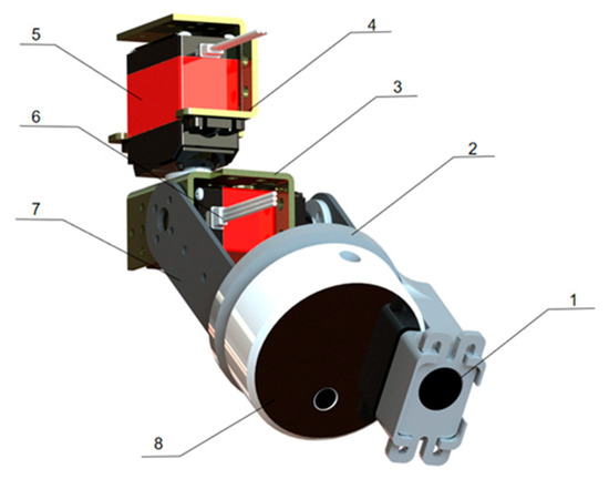 Hardware design of the multi-source imaging module. (1) Thermal camera; (2) Cameras connector; (3) Lower servo support; (4) Upper servo support; (5) Upper servo; (6) Lower servo; (7) Camera support; (8) Depth camera.