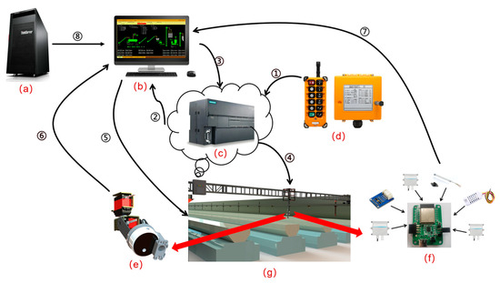 Hardware architecture of the LIVEMOS-G system. (a) server; (b) computer; (c) PLC; (d) industrial controller; (e) imaging module; (f) environmental sensing module; (g) gantry system. The overall hardware architecture is presented and its workflow with arrows ① to ⑦. ① the action of pressing a specific button on the industrial controller to update a register value in the PLC; ② the real-time monitoring of this register by upper computer. ③ when a change is detected, the upper computer writes a transient switching signal to another PLC register. ④ upon receiving this signal, the PLC activates the gantry system and controls the sensing modules to move to the designated coordinate. ⑤ upon reaching the target position, the upper computer commands the multi-source imaging and environmental sensing modules to start data acquisition. ⑥ ⑦ the simultaneous capture of image and environmental data, which are then uploaded to a specific storge directory on the upper computer for subsequent data processing tasks. ⑧ the upper computer connects to the server via Ethernet, while the server functions as a database and processes images.
