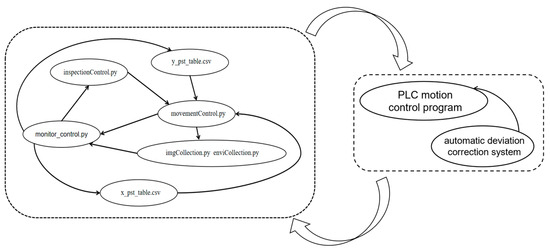 Within the automative inspection control program shown in Figure 9, the core control module (monitor_control.py) serves as the main program, responsible for coordinating the overall task flow. The inspection module (inspectionConrtol.py) executes the inspection movement commands received from the core module. The motion control module (movementControl.py) carries out the mechanical operations based on the commands from the inspection module and the predefined route coordinate tables (x_pst_table.csv and y_pst_table.csv). Meanwhile, the multi-source imaging module (imgCollection) and the environmental data collection module (enviCollection.py) acquire visual and environmental data, respectively, and transmit these data back to the core control module. All modules communicate via standardized interface communications to ensure data consistency and real-time performance.
