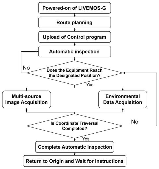 Once LIVEMOS-G is powered-on at its starting position, it waits for inspection commands. Upon receiving the signal, the system follows the predesigned inspection route. At each set position, the system halts its movement and performs multi-source data collection, including the acquisition of multi-source images and environmental data. After completing data collection at the current position, the system proceeds to the next, repeating the same procedure until the entire route is finished. Finally, the inspection unit returns to the starting position, completing the full inspection process. The overall workflow is illustrated in Figure 10.