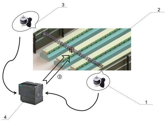 The control system of automatic deviation correction system. (1) Right-side absolute encoder; (2) Inspection system; (3) Left-side absolute encoder; (4) PLC controller.