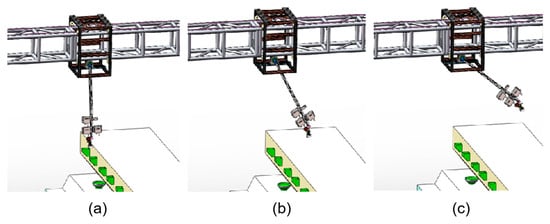 Possible operating postures of the Z-axis module. (a) Collecting data of lower cages; (b) Collecting data of upper cages; (c) passing power wire of light.