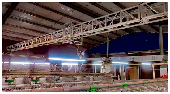 The gantry monitoring system is installed and tested in a commercial rabbit farm operated by Shandong Tutu Breeding Co., Ltd., Linyi, Shandong Province, China. As shown in Figure 1, the rabbit house measures approximately 72 m in length and 13.5 m in width, featuring a sloped roof design. The lowest point of the roof is three meters above the ground, while the eaves reached 3.6 m. There are four rows of double-sided cages arranged with a one-meter spacing between rows. Each row consists of two stacked layers, forming a pyramid-like structure.