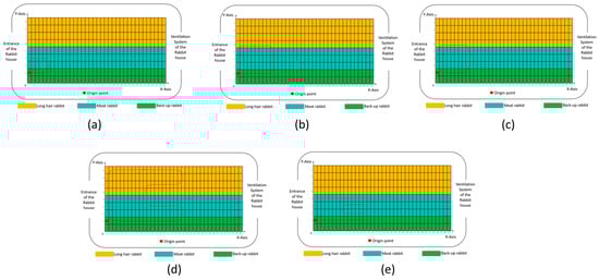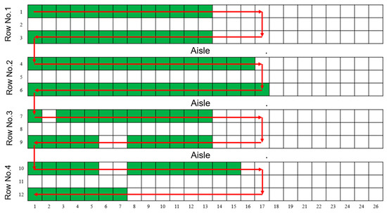 To further evaluate the potential application of LIVEMOS-G in dead rabbit detection tasks, model testing was conducted in a commercial rabbit farm in Shandong province, China, from 5 January to 12 January 2025. During the experimental inspections, the gantry collected images for cages in each row from three various viewpoints. For the testing rabbit house served as a reserved rabbit house, only the lower cages contained rabbits. Therefore, the inspection paths did not cover upper cages, nor the parts where no rabbits were kept. The designed inspection route and conditions of the rabbit cages during the experiment are presented in Figure 18.