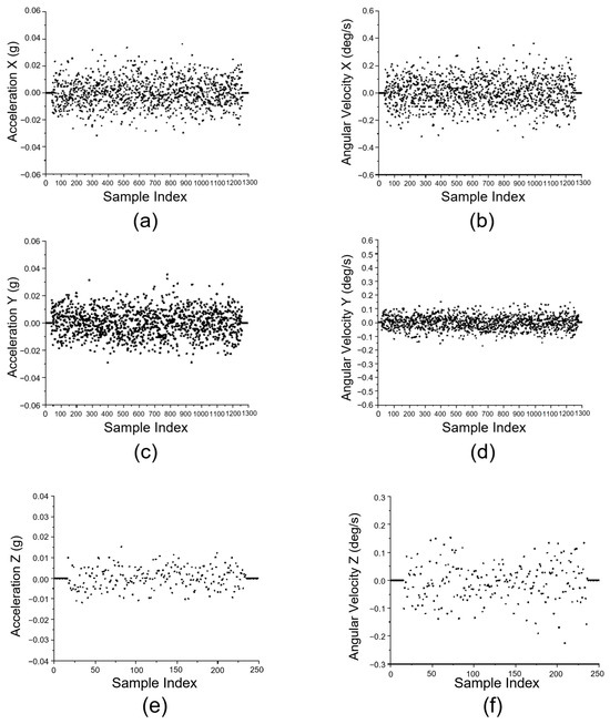 Test results from the motion stability experiment. (a) Acceleration along X-axis; (b) Angular velocity of the X-axis; (c) Acceleration along Y-axis; (d) Angular velocity of the Y-axis; (e) Acceleration along Z-axis; (f) Angular velocity of the Z-axis.