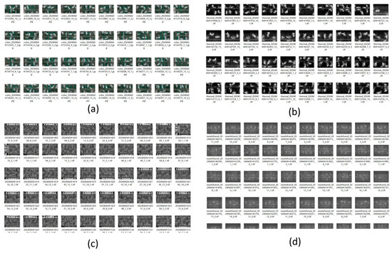 Images collected during the inspection process. (a) RGB images; (b) TIR images; (c) Depth images; (d) NIR images.
