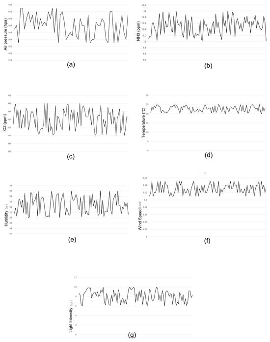 Environmental data collected during the inspection process. (a) Air pressure; (b) NH3; (c) CO2; (d) Temperature; (e) Humidity; (f) Wind speed; (g) Light intensity.