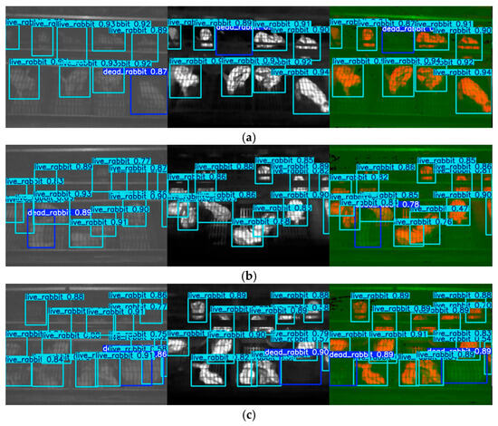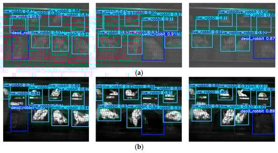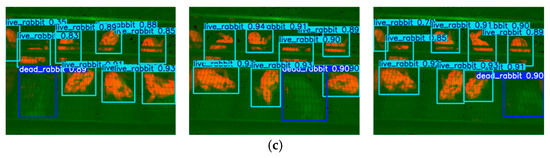 Some of the detection results are shown in Figure 22 and Figure 23. The proposed method was able to accurately detect both dead and live rabbits, generating bounding boxes closely aligned with the animal contours. It also demonstrated strong robustness when handling small targets, occlusions, and variations in rabbit pose and size. This improvement is mainly attributed to the complementary properties of NIR and TIR images: NIR images provide clear structural contours even in dim environments, while TIR images supply reliable temperature information as an indicator of mortality. By fusing these modalities, the model benefits from both structural and thermal cues, resulting in enhanced robustness and improved detection accuracy under complex farming conditions.
