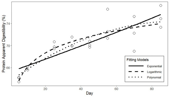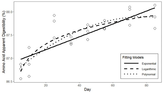 The fitted curves of the three models of apparent protein digestibility are presented in Figure 2. Based on the fitting results Table 9, the logarithmic function exhibits the highest degree of fit for the apparent protein digestibility of laying hens, with an R2 of 0.806. In comparison to the quadratic and exponential functions, the logarithmic function demonstrates a smaller standard error in the fitting results, as well as lower AIC and BIC values. In conclusion, the fitting results of the logarithmic function can be employed as the predictive model for the apparent protein digestibility of laying hens. The fitted curves of the three models of apparent amino acid digestibility are presented in Figure 3. Based on the fitting results in Table 10, similar to the protein digestibility results, the logarithmic function exhibits a higher degree of fit and smaller errors compared to the other two models. Therefore, the fitting results of the logarithmic function are selected as the predictive model for the apparent amino acid digestibility of laying hens.
