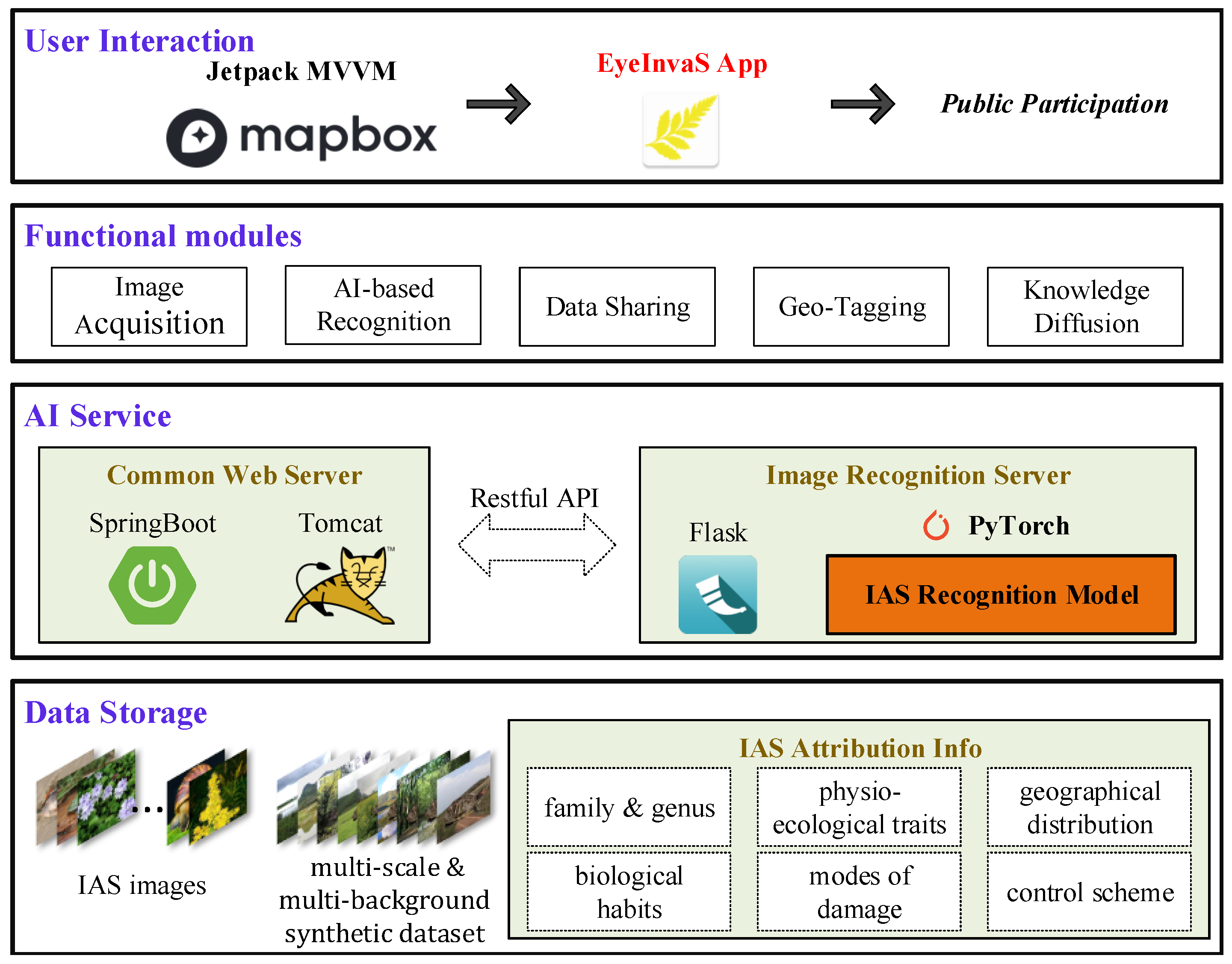 - Functional modules: Integrates key functional modules such as image acquisition, IAS recognition, data sharing, location tagging, and knowledge diffusion. These modules were designed based on a user survey identifying public priorities in invasive species detection.