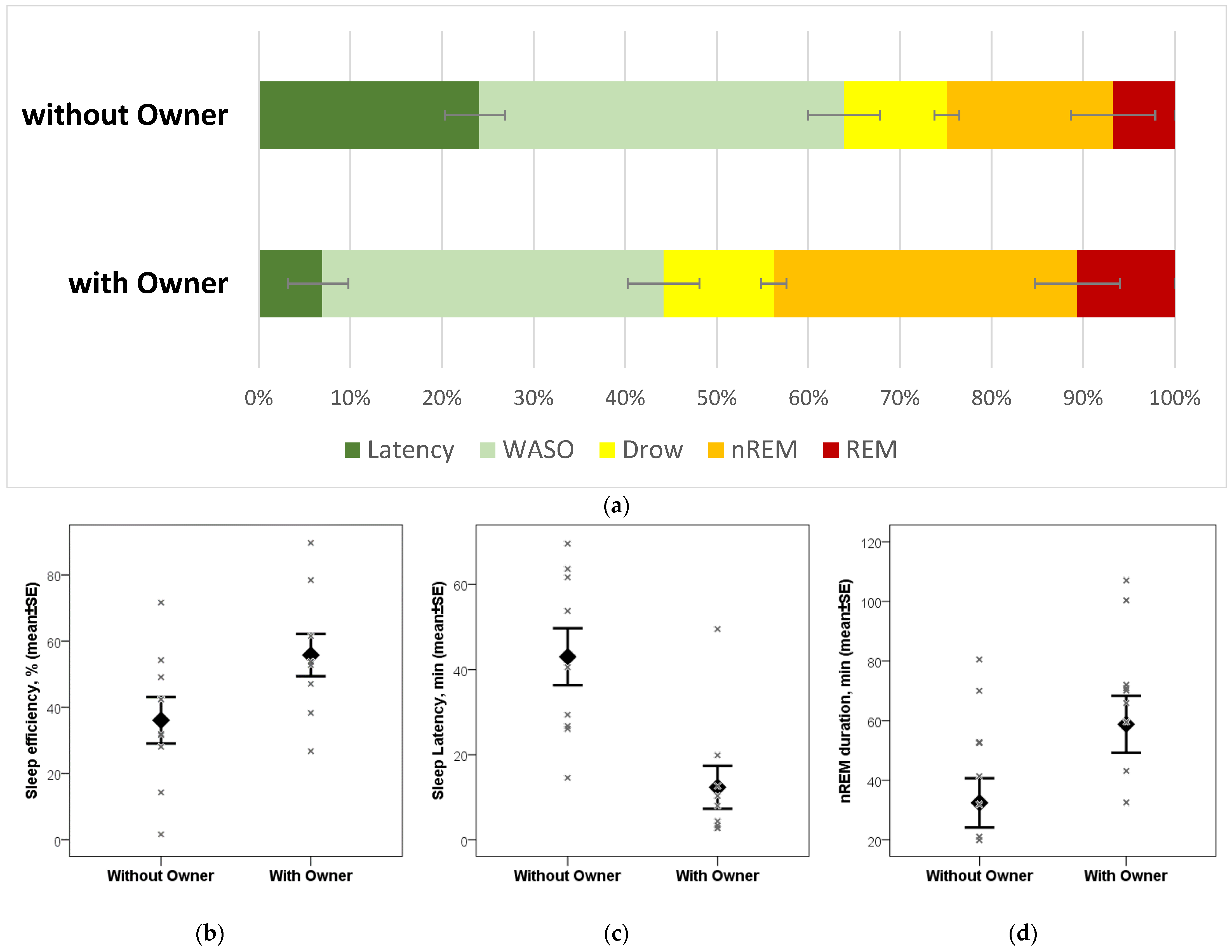 - Kis, A.; Gergely, A.; Galambos, Á.; Abdai, J.; Gombos, F.; Bódizs, R.; Topál, J. Sleep macrostructure is modulated by positive and negative social experience in adult pet dogs. Proc. R. Soc. B Biol. Sci. 2017, 284, 20171883. [Google Scholar] [CrossRef]