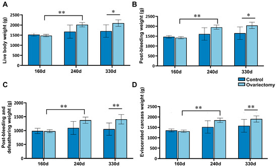 Effects of ovariectomy and growth duration on carcass-related traits in Wuding hens. (A) Live body weight (LBW), (B) post-bleeding weight (PBW), (C) post-bleeding and defeathering weight (PBDW), and (D) eviscerated carcass weight (ECW) were measured at 160, 240, and 330 days of age in both ovariectomized and intact hens. Values are presented as mean ± SEM (n = 6). * p < 0.05, ** p < 0.01.