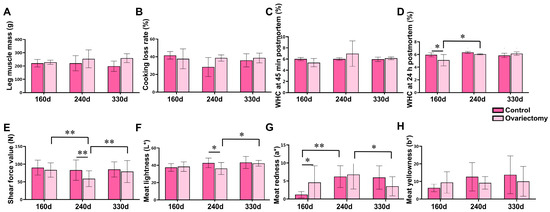 Meat quality traits were further examined in leg muscles (Figure 2). Neither age nor ovariectomy significantly influenced leg muscle weight, cooking loss, or water-holding capacity (WHC) at 45 min postmortem (p > 0.05) (Figure 2A–C). However, at 160 days, the 24 h WHC was greater in intact hens than in ovariectomized hens (p < 0.05) (Figure 2D). Notably, tenderness was affected by estrogen removal: at 240 days, shear force values were markedly lower in ovariectomized hens compared with controls and with other time points within the same group (p < 0.01), demonstrating enhanced tenderness at this stage (Figure 2E). Muscle color traits were also influenced. Lightness (L*) and redness (a*) varied significantly with both treatment and age (p < 0.05) (Figure 2F,G), while yellowness (b*) was not affected (p > 0.05) (Figure 2H).