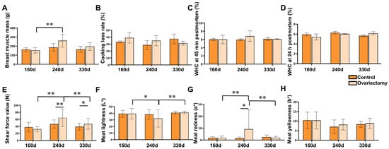 Effects of ovariectomy and age on breast muscle quality traits in Wuding hens. (A) Breast muscle mass (g). (B) Cooking loss rate (%) of breast muscle. (C) Water-holding capacity (WHC) at 45 min postmortem (%). (D) Water-holding capacity (WHC) at 24 h postmortem (%). (E) Shear force value (N). (F) Meat lightness (L*). (G) Meat redness (a*). (H) Meat yellowness (b*). Values are presented as mean ± SEM (n = 6 hens per group). * p < 0.05, ** p < 0.01.