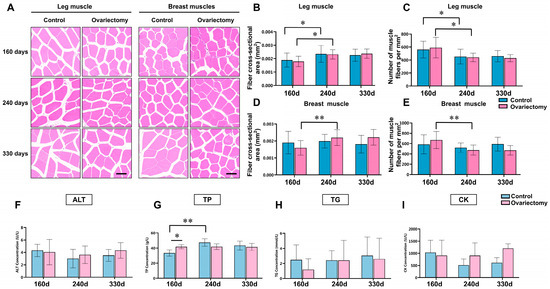 Hematoxylin–eosin (H&E) staining analysis was conducted to examine structural changes in leg (gastrocnemius) and breast (pectoralis major) muscles of Wuding hens following ovariectomy. Samples were collected at 160, 240, and 330 days of age from both ovariectomized and intact groups (Figure 4A). Muscle fiber cross-sectional area and fiber density were quantified to evaluate age- and treatment-related differences. At each age, no significant differences in either parameter were detected between the ovariectomized and control groups (p > 0.05). In both groups, however, clear age-related remodeling was observed: hens at 240 days showed larger fiber areas and reduced fiber densities compared with 160-day-old birds (p < 0.05), reflecting muscle fiber hypertrophy and a decline in fiber packing density. Similar changes were also evident within the ovariectomized group between 160 and 240 days (p < 0.05) (Figure 4B–E). These results suggest that estrogen deficiency does not alter the general trajectory of age-dependent muscle remodeling, although it may influence the timing or extent of these changes.