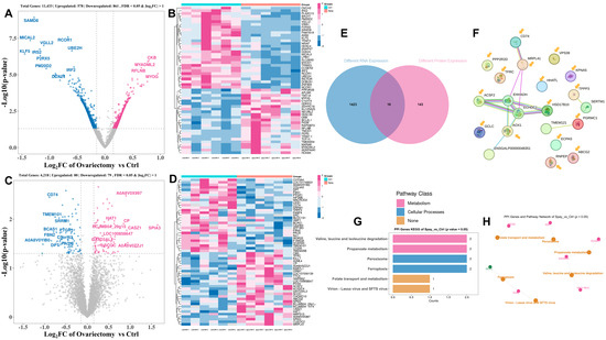 Transcriptomic and proteomic profiling of gastrocnemius muscle in ovariectomized and control Wuding hens at 160 days of age. (A,B) Differentially expressed genes (DEGs) identified by transcriptomic analysis (A) and their normalized expression levels (B). (C,D) Differentially expressed proteins (DEPs) identified by proteomic analysis (C) and their relative abundance (D). (E) Selection of key genes based on cross-omics integration. (F) Protein–protein interaction (PPI) network analysis of 16 representative genes. (G) Enrichment of signaling pathways associated with key genes. (H) Correlation analysis among the enriched pathways.