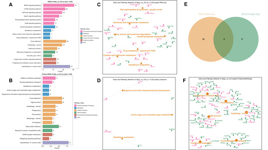 KEGG pathway annotation of transcriptomic and proteomic data from gastrocnemius muscle of Wuding hens at 160 days of age. (A) KEGG pathway enrichment of differentially expressed genes (DEGs) from transcriptome analysis. (B) KEGG pathway enrichment of differentially expressed proteins (DEPs) from proteome analysis. (C) Top enriched KEGG pathways from transcriptomic data along with associated gene sets. (D) Top enriched KEGG pathways from proteomic data along with corresponding gene sets. (E) KEGG pathways commonly enriched in both transcriptomic and proteomic datasets. (F) Representative gene sets enriched in the overlapping pathways; pink indicates upregulation and green indicates downregulation.