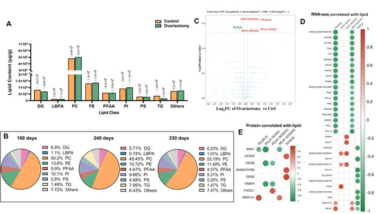 Lipid accumulation and integrative analyses in Wuding hens. (A) Comparison of total lipid content between ovariectomized and control groups. (B) Composition of lipid species in ovariectomized hens across three developmental stages. (C) Differential lipid accumulation between ovariectomized and control hens at 160 days of age. (D) Correlation analysis between differentially accumulated lipids and transcriptomic data. (E) Correlation analysis between differentially accumulated lipids and proteomic data.