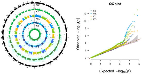 The genotypic data used in this study consisted of imputed 1X sequencing data from 2299 IMCGs. The 1X sequencing data were randomly selected from the 10X high-coverage sequencing data as part of the research group’s previous work [20]. Quality control was implemented in PLINK v1.90 [21] with the following thresholds: minimum allele frequency (MAF) < 0.01, Hardy-Weinberg equilibrium p-value < 1 × , and an SNP call rate < 0.90 for individuals. The retained loci were used for subsequent analysis. After quality control of the 1X resequencing data for IMCGs, 67,021 SNPs were retained for GWAS and GS. It was showed that no significant population stratification was obtained among the 2299 IMCGs through PCA analysis.