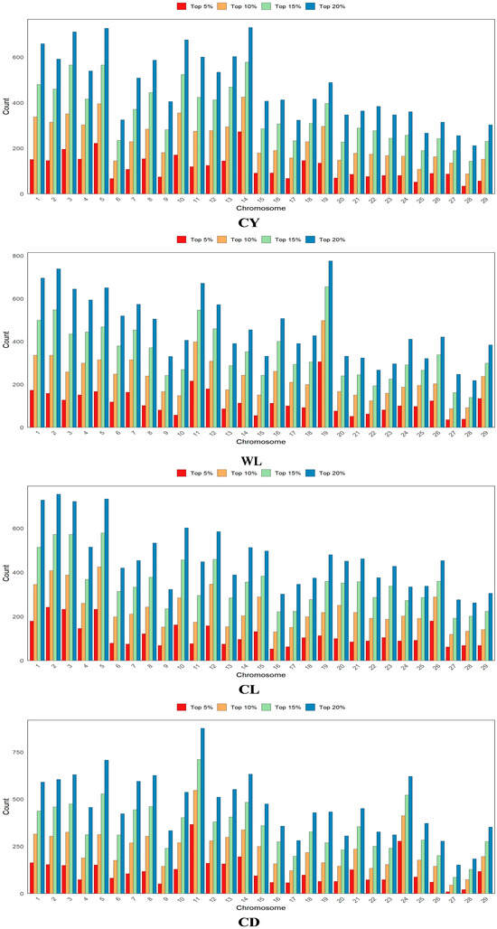 Based on the GWAS results, SNPs were ranked according to their p-values, and the top 5%, 10%, 15%, and 20% were selected as prior marker information for GS analysis. Specifically, the top 5% included 3351 SNPs, the top 10% encompassed 6702 SNPs, while the top 15% and 20% consisted of 10,053 and 13,404 SNPs, respectively. The chromosomal distribution of fleece trait-related prior information is illustrated in Figure 2, highlighting the variation in SNPs associated with the genetic control of each trait.