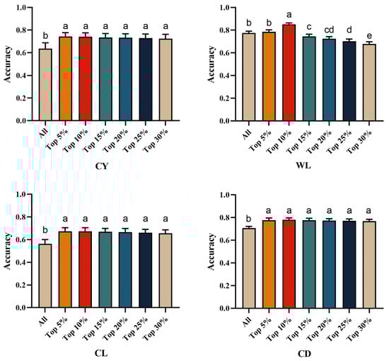 Multiple comparison plots of genome prediction accuracy for fleece traits with integrated Top prior information. Different letters indicate significant difference at p < 0.05, and the same letters indicate insignificant difference at p > 0.05. CY = cashmere yield; WL = Wool length; CL = cashmere length; and CD = cashmere diameter.