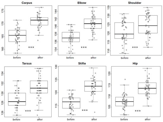 As shown in Figure 2, completion of the 10-session UWTM programme increased PROM values in all joints (p < 0.001 in all cases). The median PROM for the carpus increased from 165.5° before therapy to 171.5° after therapy (improvement of 3.61%), for the elbow from 137.0° to 140.7° (2.98%), for the shoulder from 119.5° to 124.2° (2.82%), for the tarsus from 128.2° to 131.0° (1.95%), for the stifle from 116.5° to 122.5° (5.20%), and for the hip from 107.5° to 113.5° (5.62%).