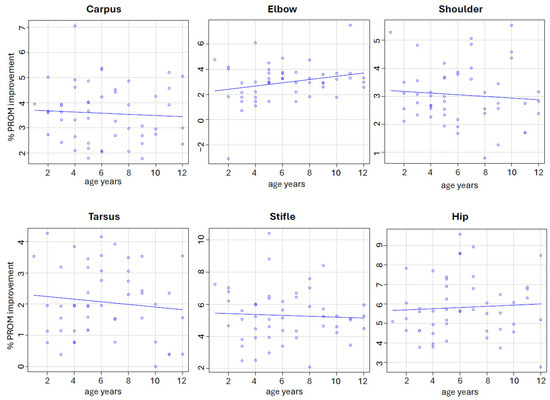 Spearman’s rank correlation coefficients between the dogs’ age and the percentage improvement in PROM were as follows: carpus, rho = −0.059; elbow, rho = 0.198; shoulder, rho = −0.064; tarsus, rho = −0.023; stifle, rho = −0.044; and hip, rho = 0.119. In all cases, the correlations were not statistically significant (p > 0.05), suggesting no meaningful relationship between the dogs’ age and therapeutic response (Figure 3).
