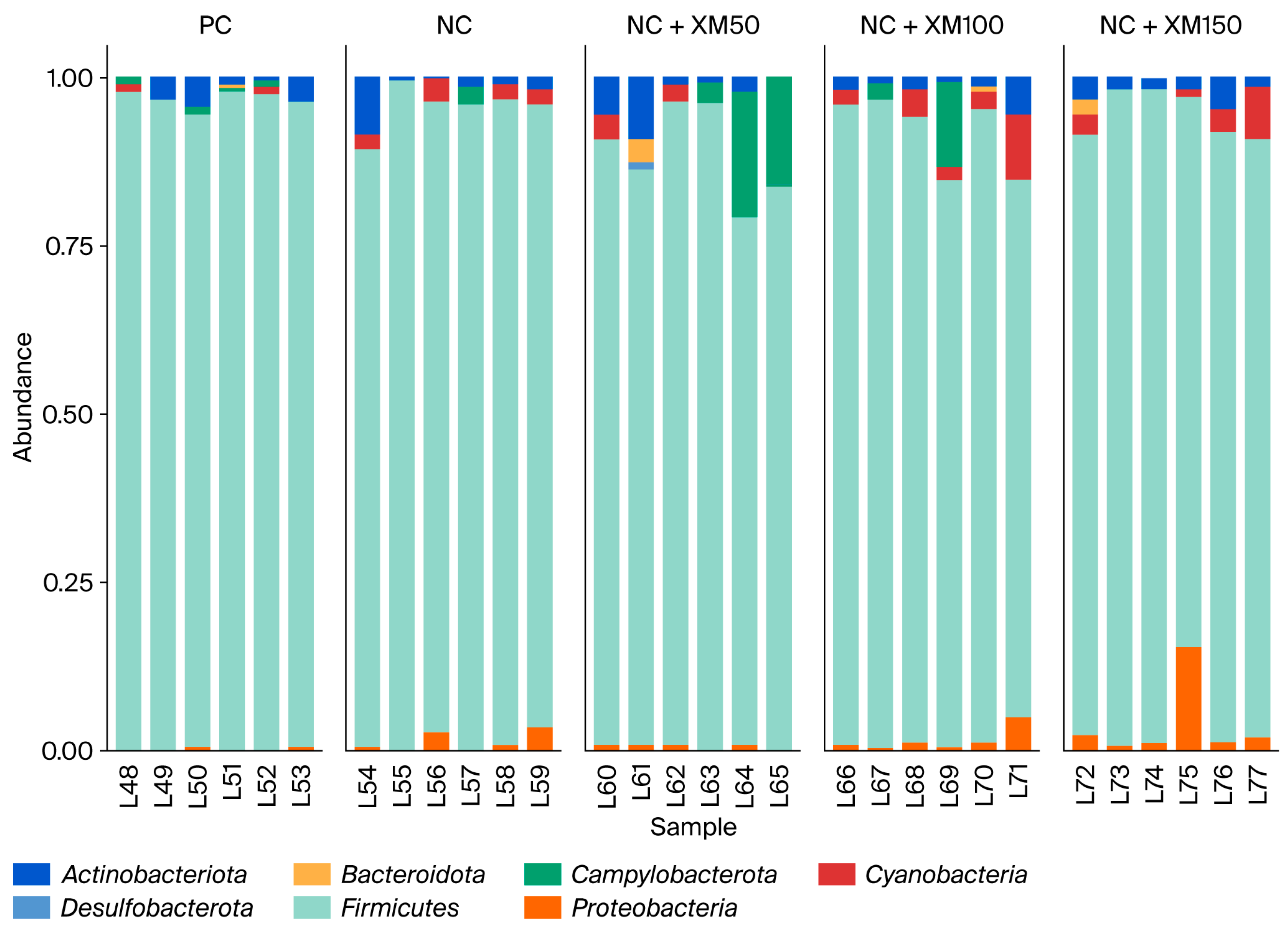 Bacteroidota when compared to the PC and NC treatment. These changes suggest that xylanase can positively modulate the intestinal microbiota, in a way that favors beneficial bacteria to grow while reducing the presence of opportunistic pathogens.