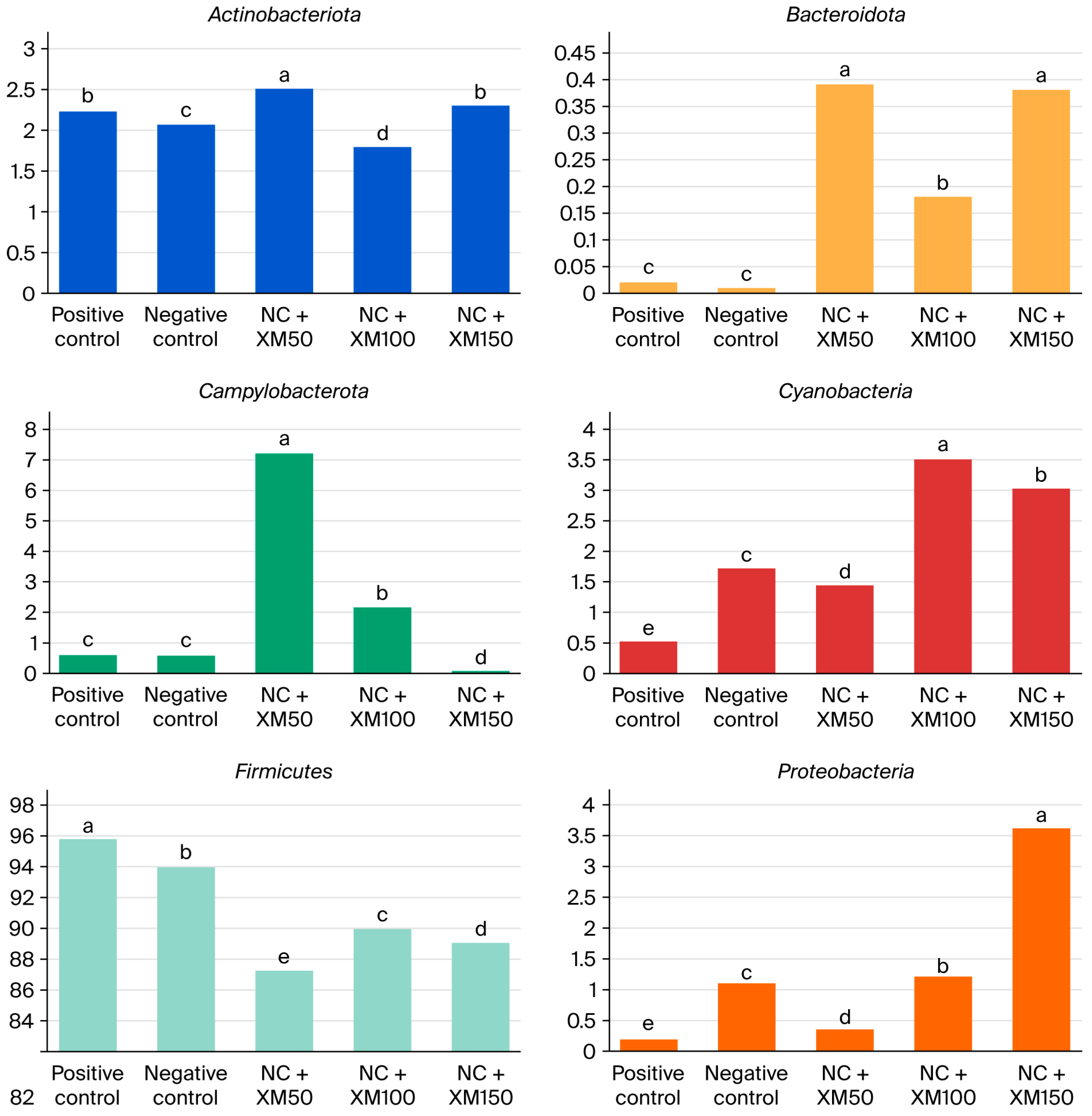 Actinobacteriota is a phylum of gram-positive bacteria, also known as actinomycetes or actinobacteria. These bacteria have a filamentous, often branched, organization, and despite many members of this phylum being commensal bacteria, a major proportion is also associated with the manifestation of certain diseases in animals. In the context of this study, they represented 4.9% of the phyla found in birds, and their reduction with the inclusion of 100 g/MT of xylanase may indicate a decrease in potential pathogens, contributing to the intestinal health of birds [