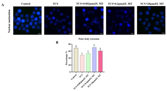 Figure 1. Melatonin restores TCS-impaired meiotic progression in porcine oocytes. (A) Representative fluorescence images of the first polar body in the control, TCS, and TCS + MT groups (0.002, 0.2, and 20 μmol/L). Scale bar = 100 μm. (B) Expulsion rate of the first polar body in the control, TCS, and TCS + MT groups (0.002, 0.2, and 20 μmol/L). Different letters above bars indicate significant differences (p < 0.05).