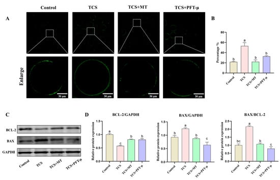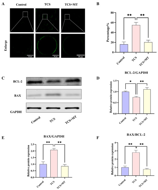 Western blot analysis indicated that TCS altered the expression profile of BCL-2 family proteins, reducing the anti-apoptotic protein BCL-2 (p < 0.05) and elevating the pro-apoptotic protein BAX (p < 0.01), which led to a marked increase in the BAX/BCL-2 ratio (p < 0.01). Administration of MT significantly increased BCL-2 levels (p < 0.01), decreased BAX expression (p < 0.01), and restored the BAX/BCL-2 ratio (p < 0.01), indicating a strong suppressive effect on the mitochondrial pathway of apoptosis (Figure 3C–F).